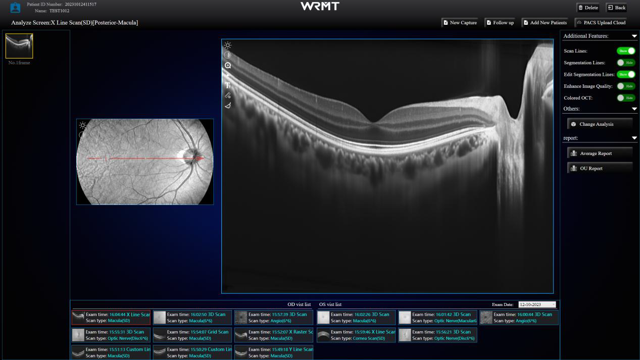 VELITE C3000 працює зі швидкістю до 120 000 A-сканів за секунду, що забезпечує стабільне сканування та зменшує вплив рухів пацієнта. Прилад формує детальні пошарові OCT-зображення сітківки, чітко візуалізуючи анатомічні межі та мікроструктурні зміни між шарами.