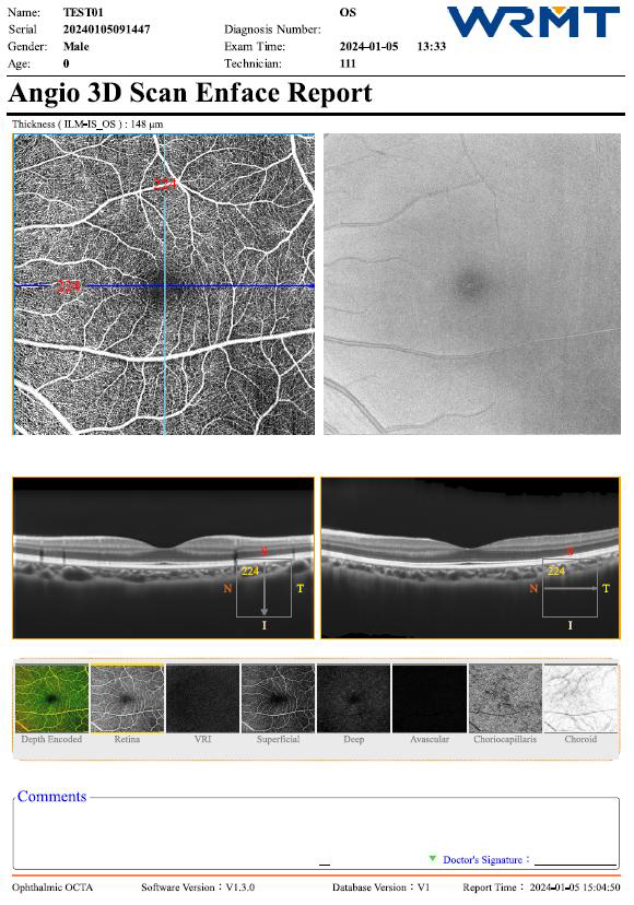 Система підтримує ширококутну OCT-ангіографію (OCTA) з полем огляду до 12 × 12 мм, що дозволяє неінвазивно оцінювати мікроциркуляцію очного дна та судинні сплетіння без використання контрастних речовин. Вбудовані алгоритми автоматичного зниження шумів забезпечують високу чіткість зображень і достовірність аналізу навіть дрібних судинних структур.